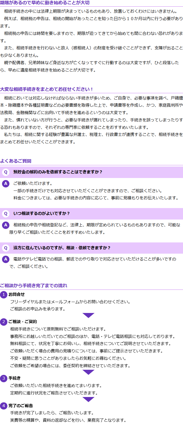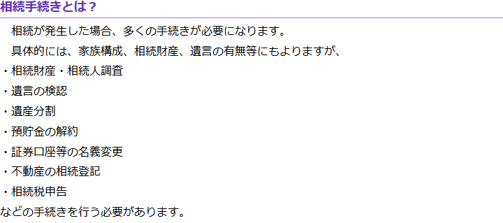 このような相続手続きは、何度も行うようなものではないため、分からないことを調べながら対応するには時間がかかりますし、預金、株式、不動産など、亡くなった方の財産の種類や数が多いと、その分手間もかかります。